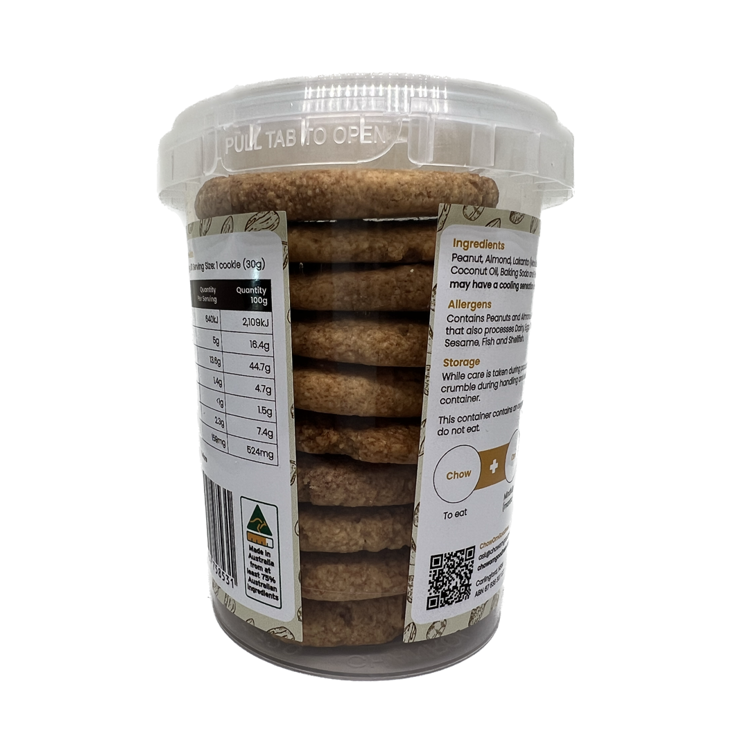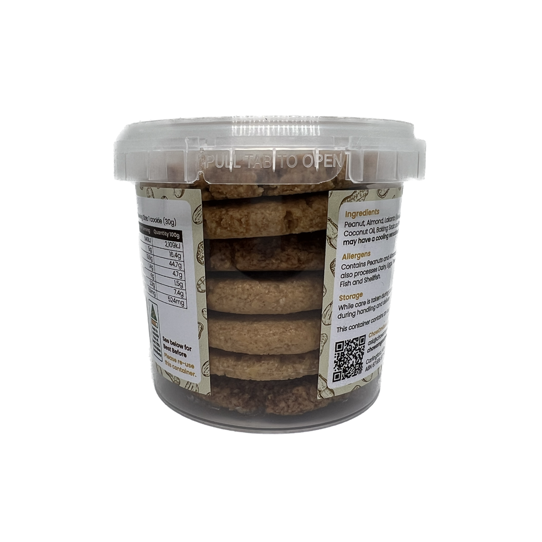 Comes in a tub of 10 (300g) or 7 (210g) good sized cookies.